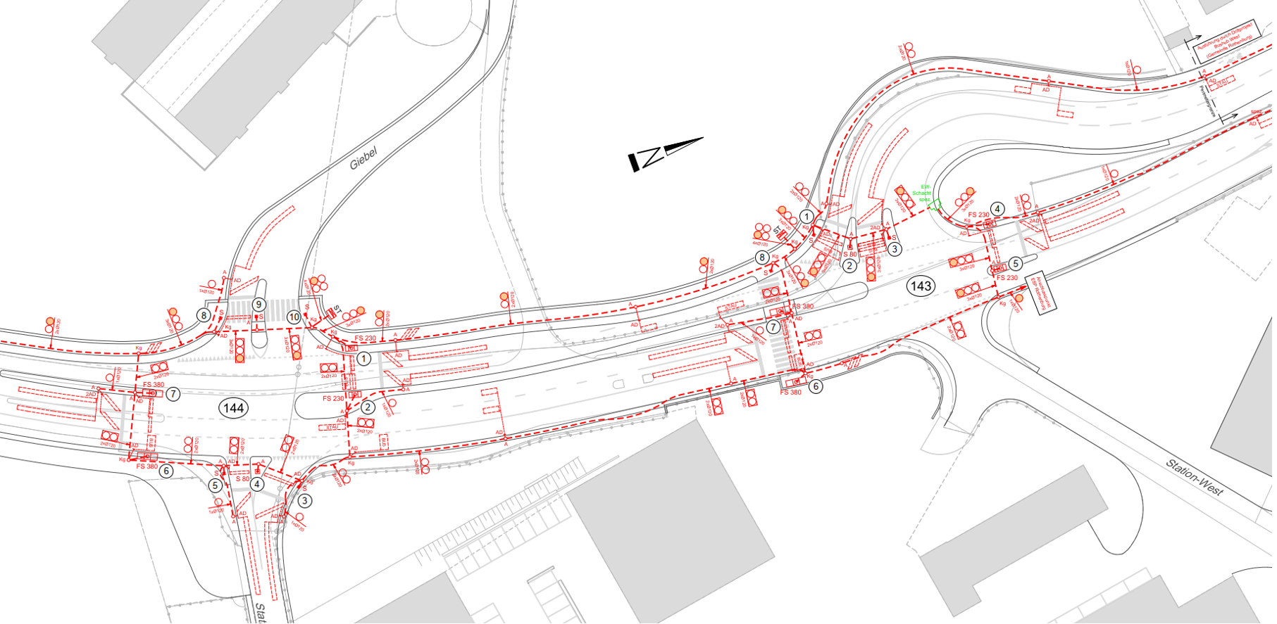 Mit der Realisierung der neuen Lichtsignalanlagen Nr. 143 (Stations-/Hasenmoosstrasse) und Nr. 144 (Station West/Giebel/Stationsstrasse) werden die verkehrstechnischen Infrastrukturen geschaffen, um den Verkehr Richtung Autobahnanschluss A2 in den Spitzenstunden dosieren zu können. Neu wird die Begrenzung des Siedlungsgebiets bis zur LSA Nr. 040 (Lohren) ausgedehnt, so dass die neu projektierten LSA Nr. 143 und Nr. 144 innerorts liegen werden.