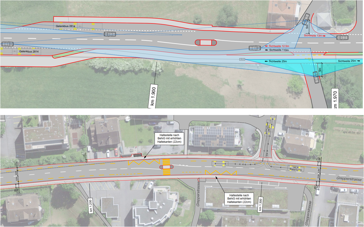 Im zweiten Schritt wird ein Betriebs- und Gestaltungskonzept erstellt mit dem Ziel neu eine Radverkehrsinfrastruktur in den bestehenden Querschnitt mit beengten Verhältnissen zu integrieren. Mit der Auftraggeberschaft wird ein breites Variantenstudium mit Ersatzrouten, Fuss- und Radwegen, Radstreifen, Kernfahrbahnen und Mischverkehr mit Tempo-Reduktionen geprüft und anhand eines vordefinierten Kriterien Sets und geeigneten Messindikatoren qualitativ geprüft. Die Grepperstrasse wird neu mit einem Eingangstor, Mittelinseln bei allen Fussgängerstreifen und Trottoirüberfahrten ausgestattet. Im Abschnitt innerorts werden Radstreifen und im letzten Abschnitt vor dem Zentrum eine Tempo-30-Signalisation umgesetzt. Die Bushaltestellen werden bezüglich Barrierefreiheit überprüft und die Bestvariante im CAD projektiert.
